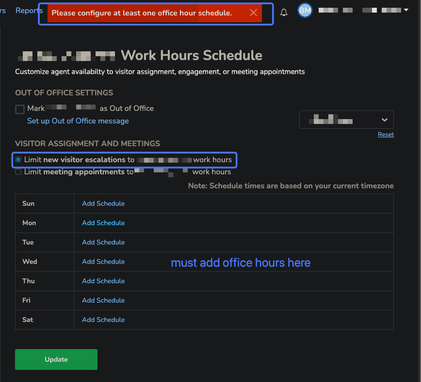 To ensure customer expectations are managed correctly, we have refined the office hours configuration process. When you enable the option to “limit new visitor escalations to my work hours,” the system will now require you to define your specific schedule. This change eliminates confusion regarding when Out-of-Office (OOO) messages are triggered, ensuring your team only receives live escalations when they are actually available to respond.